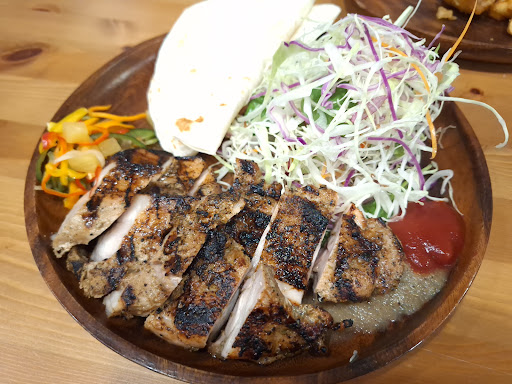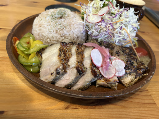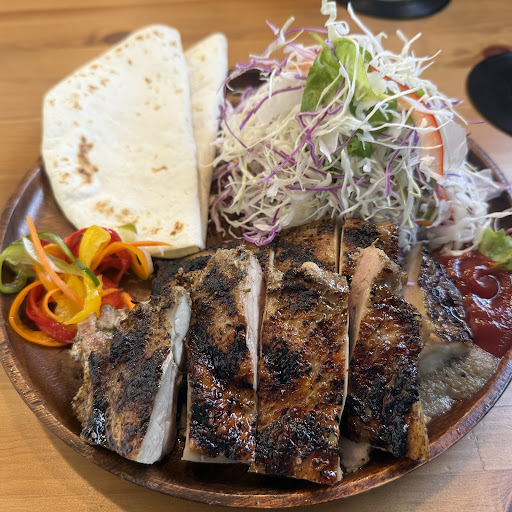 ジャークチキンとジャークポークのハーフ&ハーフランチはトルティーヤで。